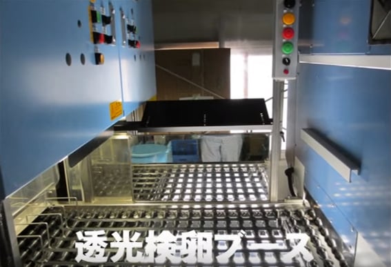 透光検卵ブースでは、キャンドリングといって、卵に下から光を当てて卵の中を透かして見て、ヒビやシミがある卵や、血液が入っている卵を、人の目で見つけて取り除きます。