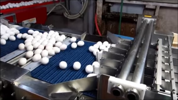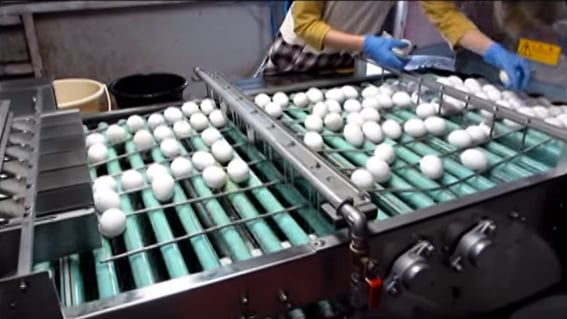まず鶏舎で産卵された卵は、バーコンベアーでゆっくりと運ばれてきて、