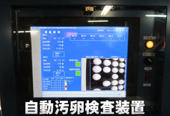 さらに、「自動汚卵(おらん)検査装置」で卵を1個1個画像判定し、汚れた卵を選別し機械が取り除きます。人の目と機械のダブルチェック ですね!