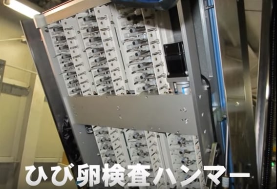 1個の卵につき60回叩き、叩いた時の音を聞き分けて、ひびの入った卵を選別します。